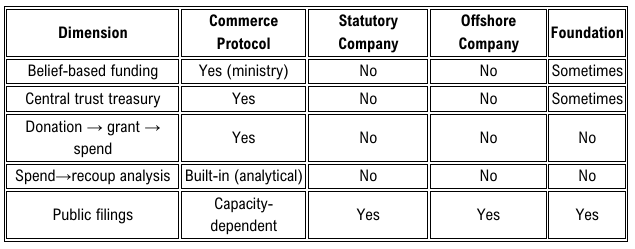 The Commerce Protocol is best understood as a two-pillar, capacity-aligned model integrating belief-based ministry funding with fiduciary trust treasury administration. Its distinguishing feature is the donation → grant → treasury spend architecture, coupled with an analytical abandoned-credit lens applied to treasury operations.